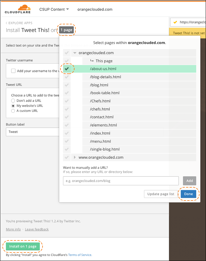 Choose which pages on your site the App will appear by clicking the All Pages button at the top of the page. To apply the App to one (1) page, choose 1 page.